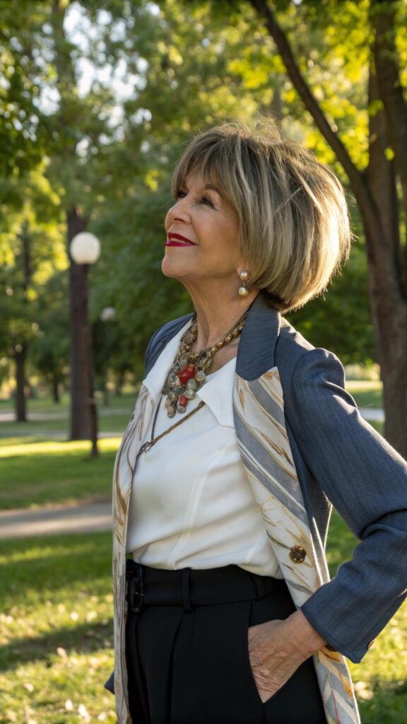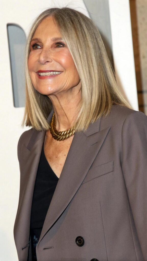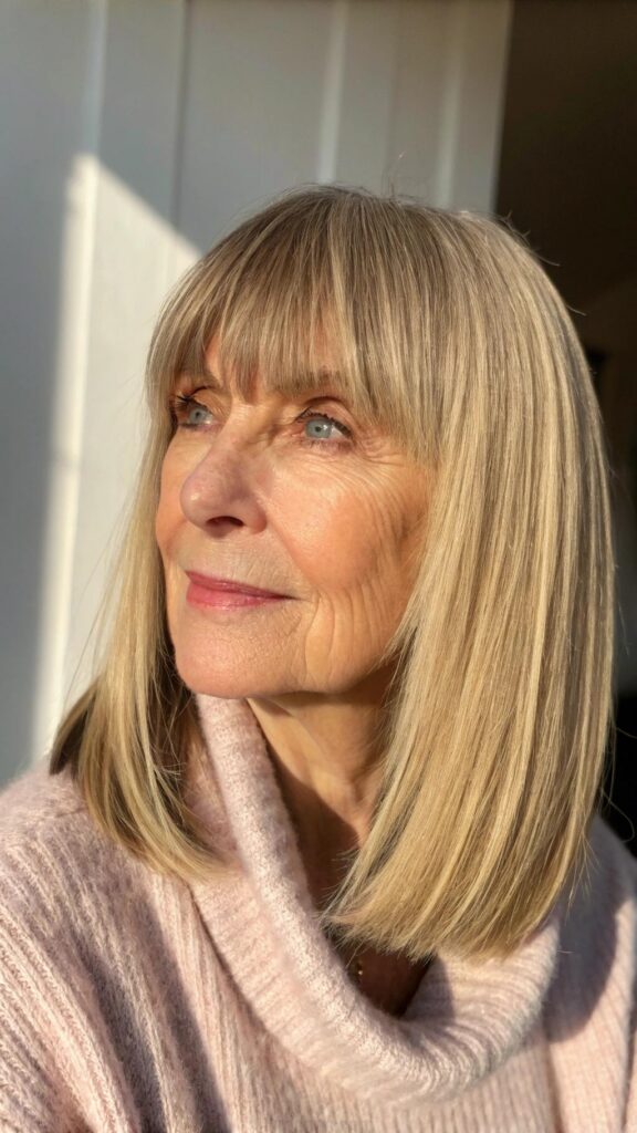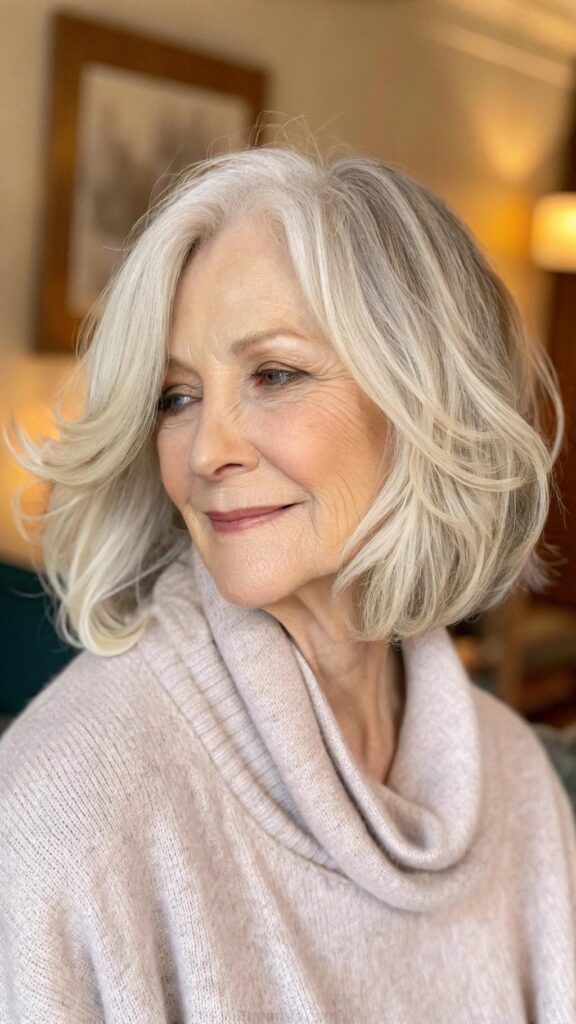 A shoulder-length blunt cut is a sleek and sophisticated option for women over 60. This hairstyle works well for fine flat hair, as the blunt ends create the illusion of thickness. It’s a timeless look that never goes out of style.