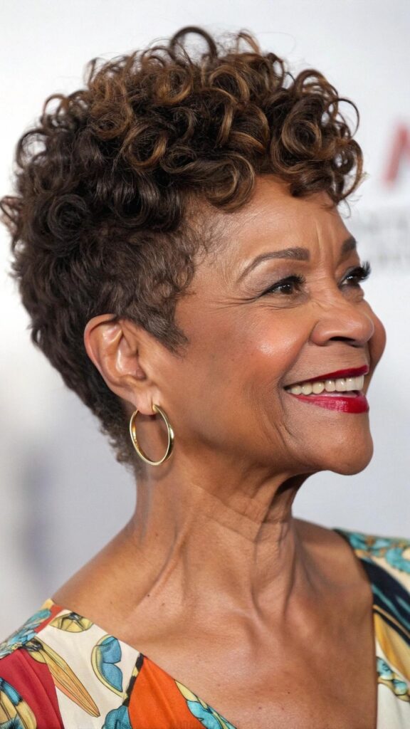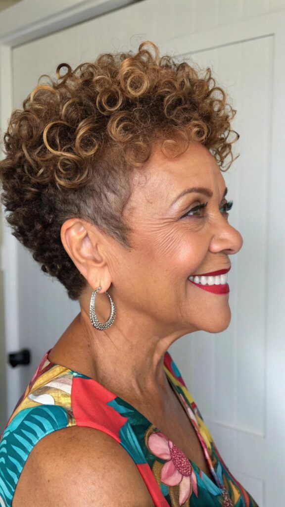 A curly pixie with tapered sides is a fun and flirty option for women over 60. This haircut features short, tapered sides and defined curls on top. It’s perfect for adding volume and texture to fine flat hair.