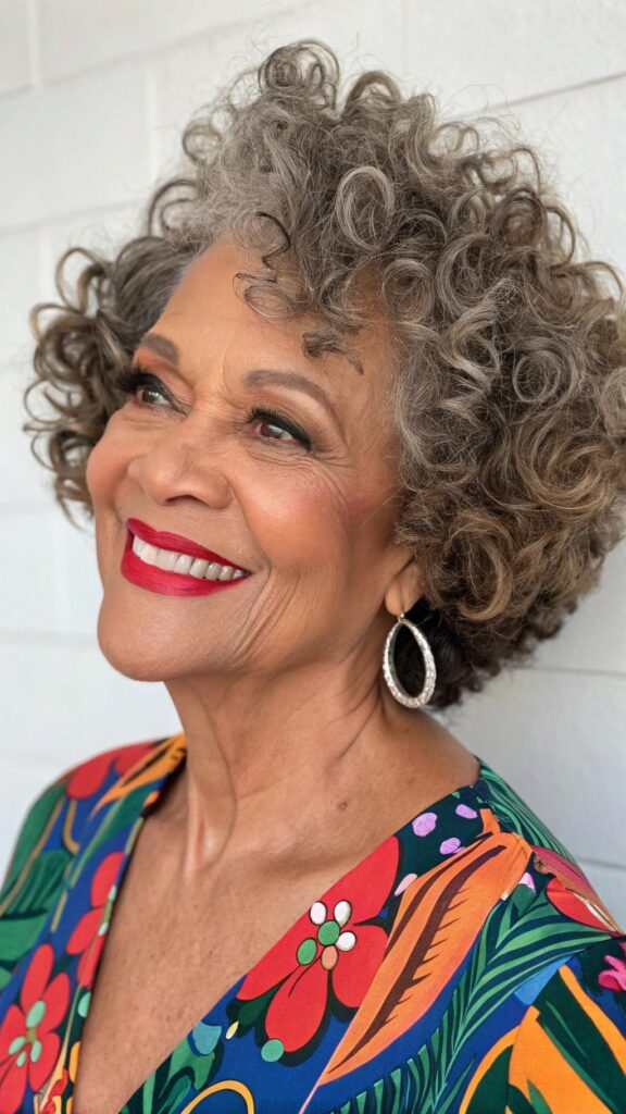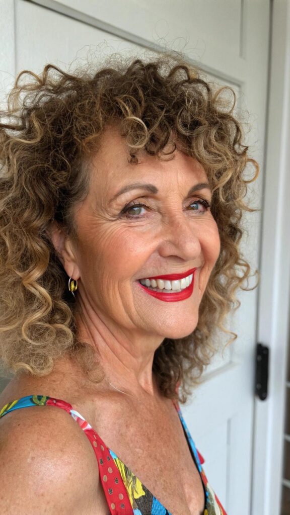 The curly shag with side-swept bangs is a fun and flirty option for women over 60. This haircut features choppy layers and defined curls, creating a playful and youthful look. It’s perfect for adding volume and texture to fine flat hair.