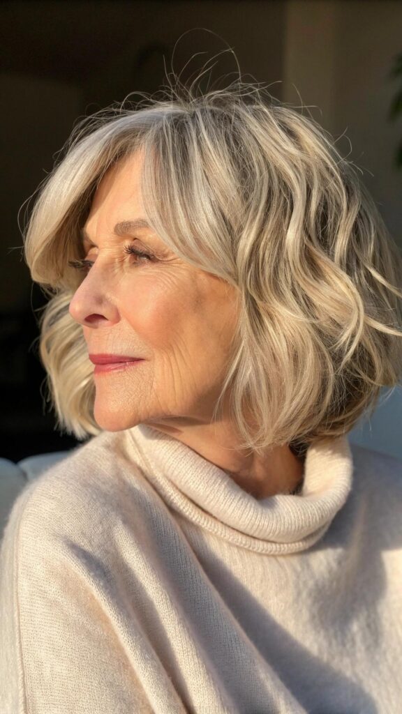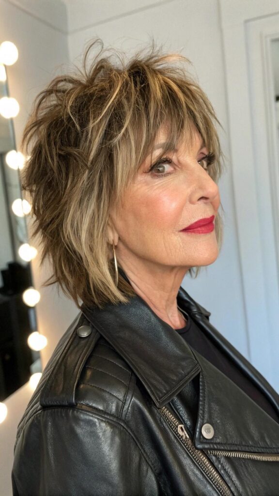 The wavy shag with choppy layers is a fun and flirty option for women over 60. This haircut features loose waves and textured layers, creating a playful and youthful look. It’s perfect for adding volume and movement to fine flat hair.