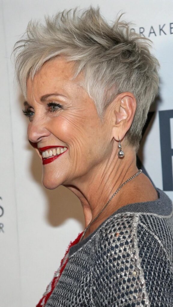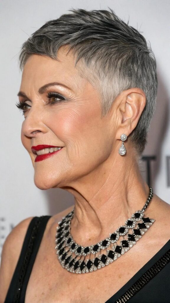 A sleek pixie with a textured top is a bold and modern choice for women over 60. This haircut features short sides and back with longer, textured layers on top. It’s perfect for adding volume and movement to fine flat hair.