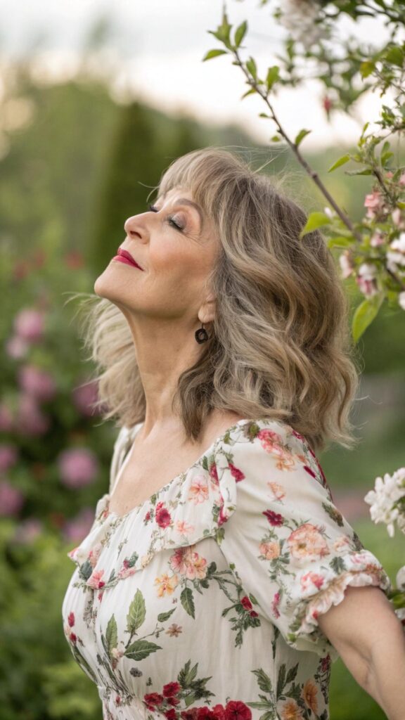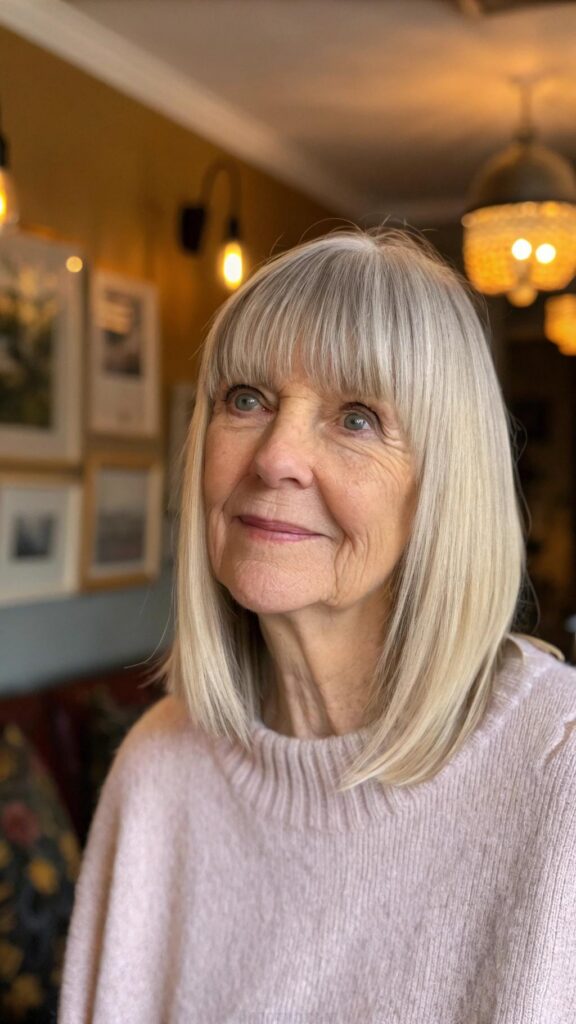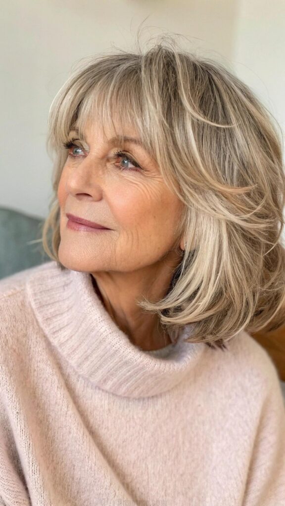 A blunt cut with wispy bangs is a soft and elegant option for women over 60. This hairstyle features straight, blunt ends and delicate, wispy bangs. It’s perfect for fine flat hair, as the blunt cut creates the illusion of thickness.