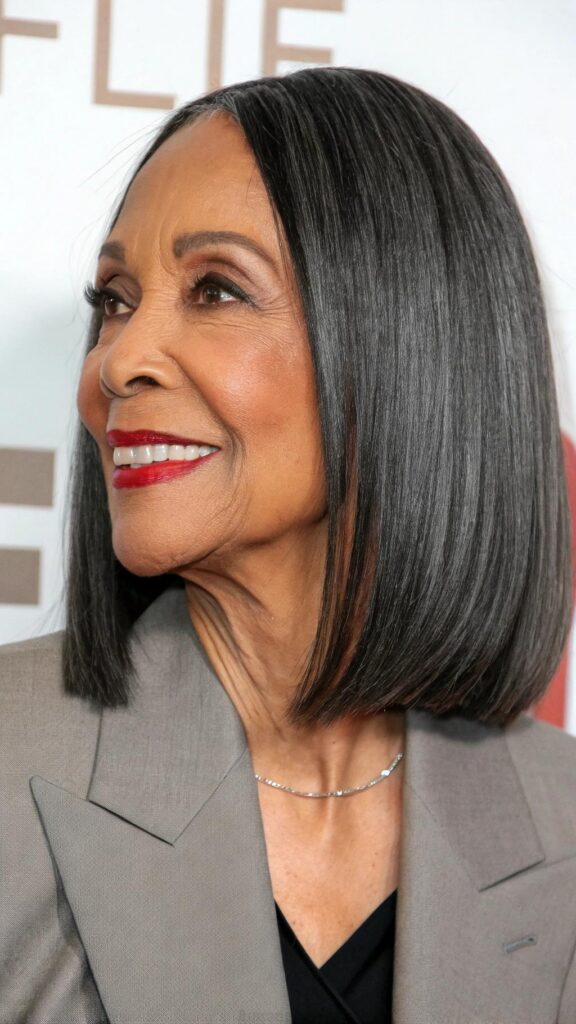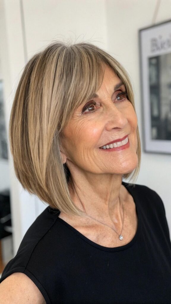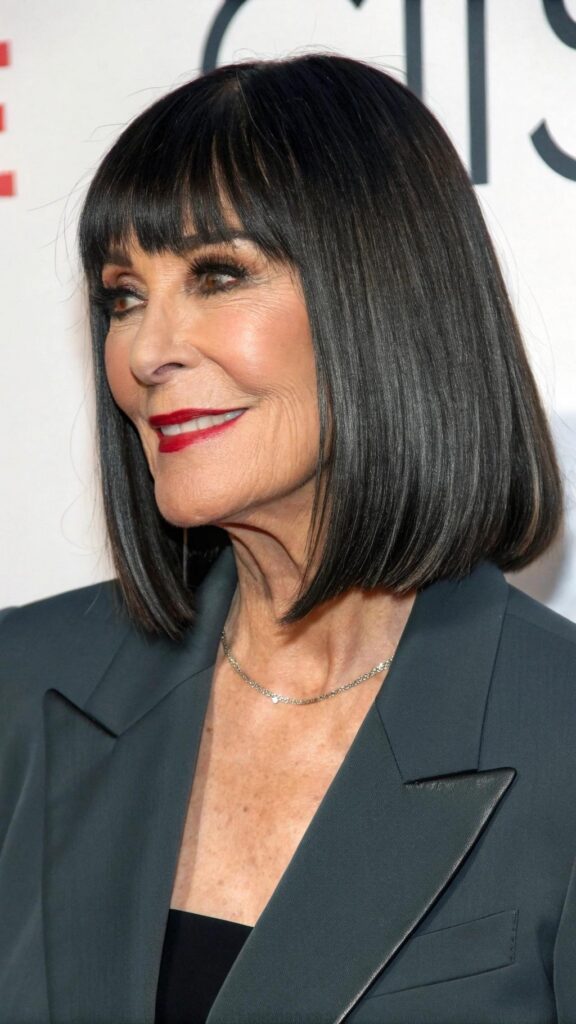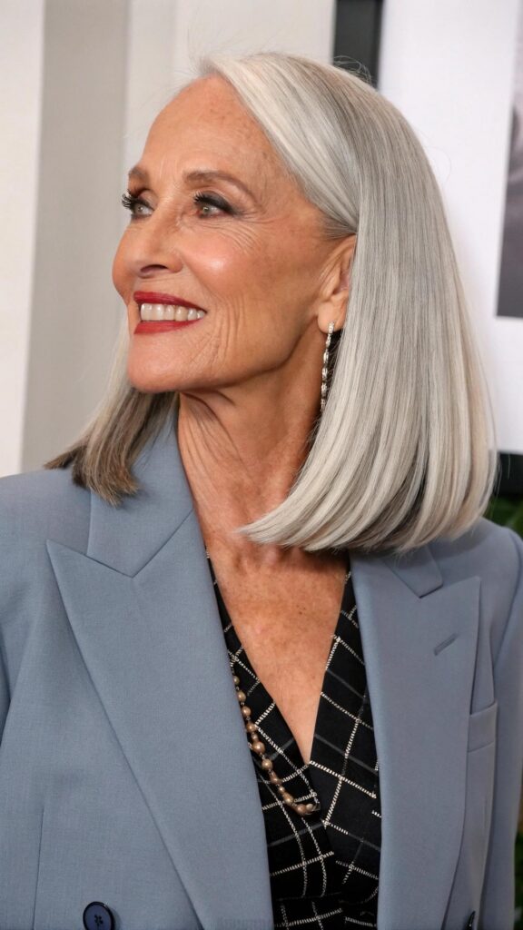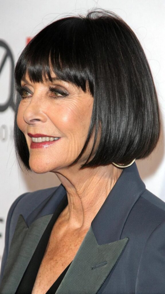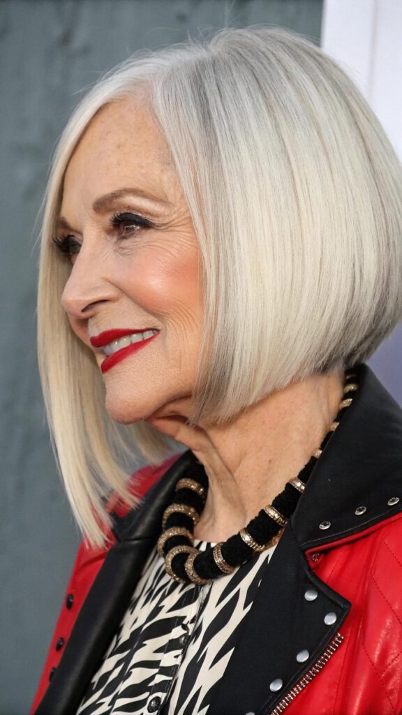 A sleek bob with angled ends is a bold and modern choice for women over 60. This haircut features straight, angled ends that create a sharp and polished look. It’s perfect for fine flat hair, as the angles add volume and structure.