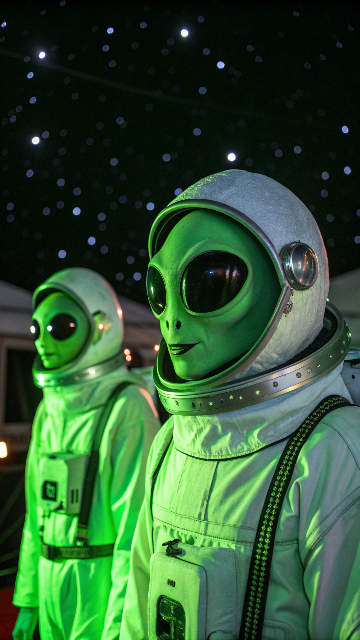 Aliens beam down strangely. Green skin glows neon. Antennae stick out.
