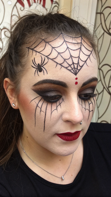 Blend black lipstick for an ominous smile. Add spider web details on cheeks. This idea suits group costumes.