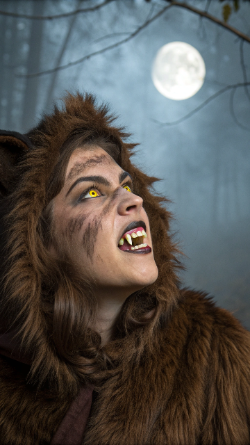 Werewolves transform under moons. Fur patches with brown makeup. Yellow contacts glare.