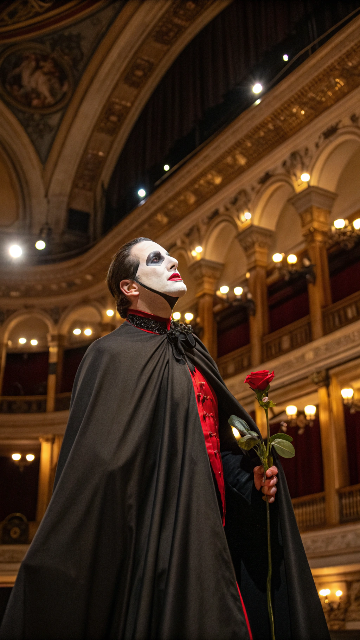 Cape swirls black. Opera lights dim. Mask hides scars.
