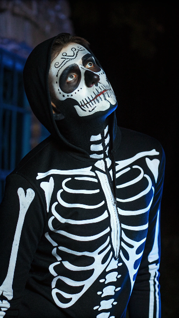 Skeletons shine in the dark. Outline bones with white paint. Blacken around eyes for sockets.