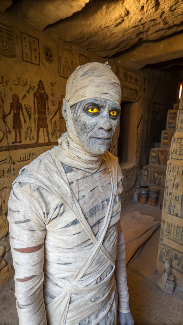 Mummies unravel ancient. Bandages wrap loose. Eyes peek yellow.