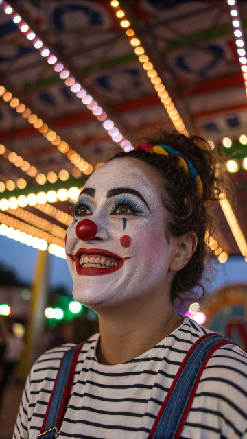 Add tears for creepy vibe. This idea works for circuses. Laughter follows the look.