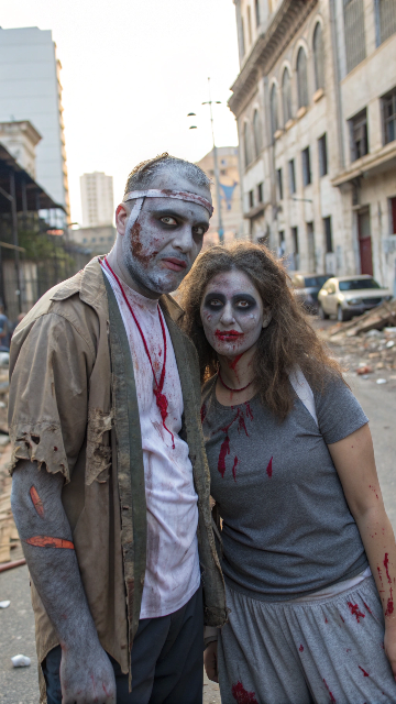 Zombies shuffle with decayed looks. Tear fake skin for wounds. Paint gray tones on the face.