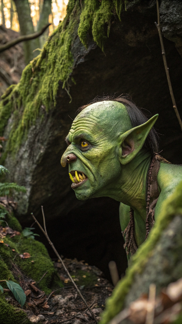 Goblins sneak green. Ears flop long. Teeth jagged yellow.