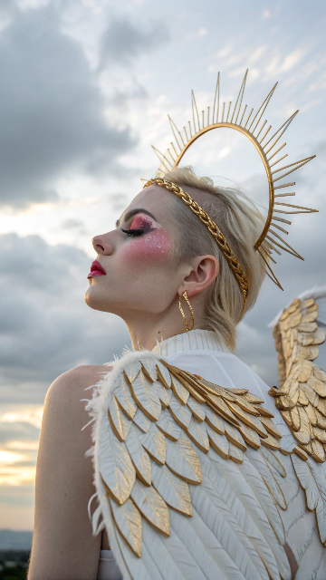 Angels glow heavenly. Halo circles gold. Wings feather out.