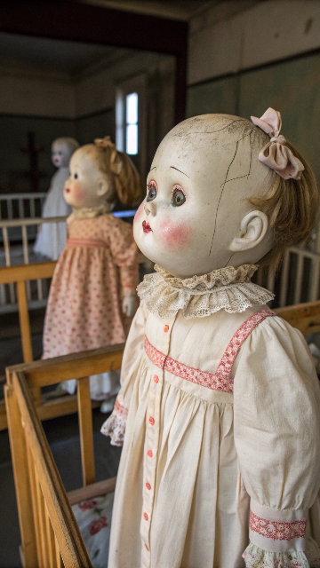 This eerie toy unnerves. Nurseries set scenes. Smiles hide secrets.