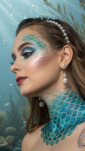 Fishnet helps pattern the scales. Iridescent powder shines. Seashells accessorize.