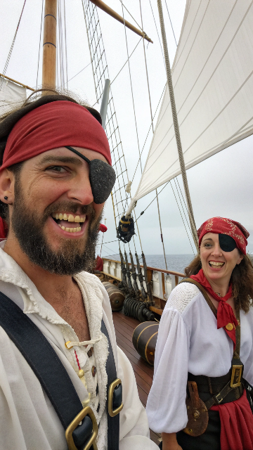 Pirates sail with scars. Eye patch covers one side. Beard stubble roughens.