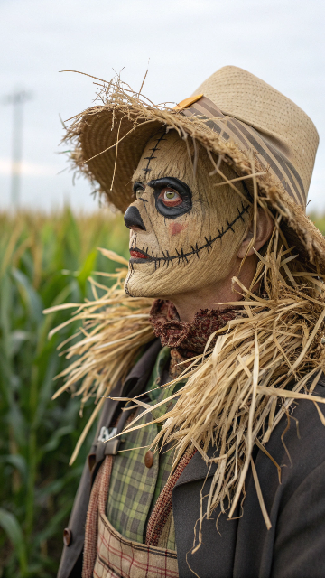 Button eyes stare. Hat flops down. Corn stalks surround.