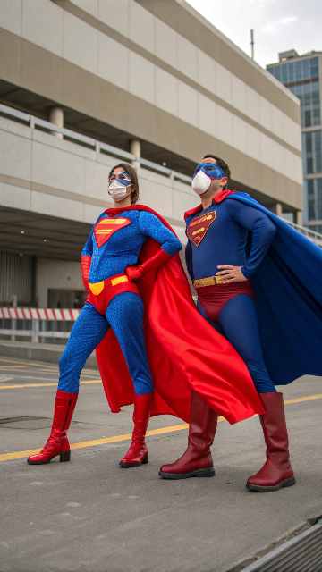 Superheroes save with bold lines. Mask outlines in red and blue. Cape flows behind.