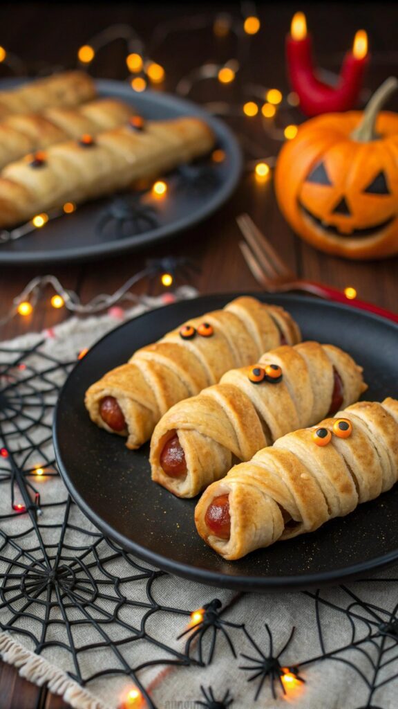 Mummy hot dogs are a simple, kid-friendly Halloween treat. Wrap hot dogs in crescent roll dough to create a mummy look. Bake until golden for a spooky snack. Guests love the playful design and savory flavor. Serve with ketchup and mustard for dipping. This dish is quick to prepare and budget-friendly. For a creepy touch, add edible eyes made from candy or cheese. Pair with a spooky punch for a complete party vibe. Everyone will enjoy these bite-sized delights.
