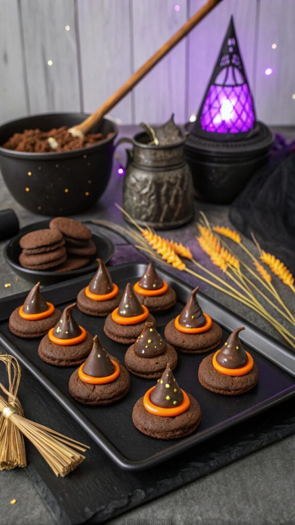 Witch hat cookies are a sweet Halloween treat. Use chocolate cookies and Hershey’s Kisses for hats. Add orange icing for a festive band. These cookies are crunchy and chocolatey. Serve on a platter for easy grabbing. They’re a great dessert option. Use a piping bag for precise icing. This treat is quick to make. Kids will love the witchy vibe.