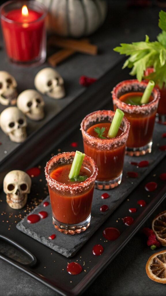 Bloody Mary shots are a spooky adult drink. Mix tomato juice, vodka, and hot sauce for a bold flavor. Rim glasses with red salt for a bloody effect. These shots are spicy and savory. Serve chilled for the best taste. They’re perfect for Halloween parties. Add a celery stick for garnish. This drink is quick to prepare. Guests will enjoy the festive kick.