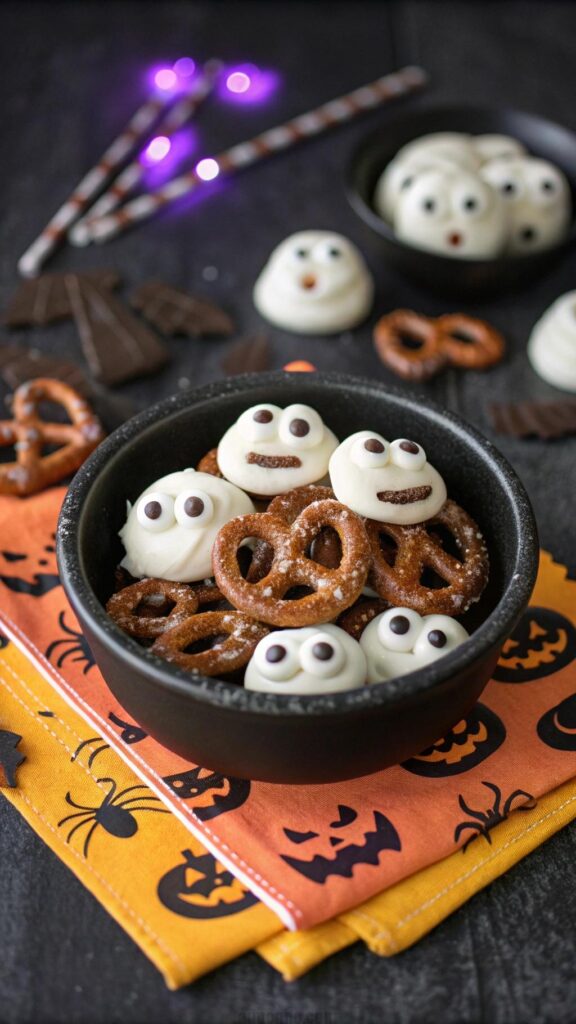 Ghost pretzel bites are a quick Halloween snack. Dip pretzels in white chocolate and add candy eyes. Sprinkle with powdered sugar for a ghostly effect. These bites are sweet and crunchy. Serve in a bowl for easy grabbing. They’re perfect for last-minute prep. Use mini pretzels for bite-sized treats. This snack is kid-friendly and festive. Guests will love the cute design.