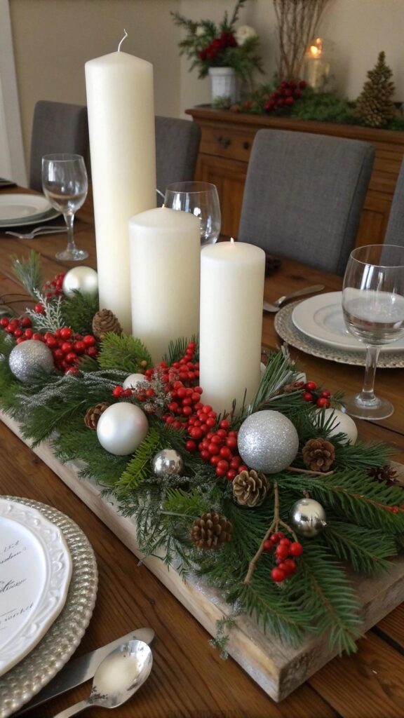 A stunning table centerpiece elevates your Christmas dining experience. It becomes the focal point of your holiday meals. Combine elements like candles, evergreens, and ornaments.
