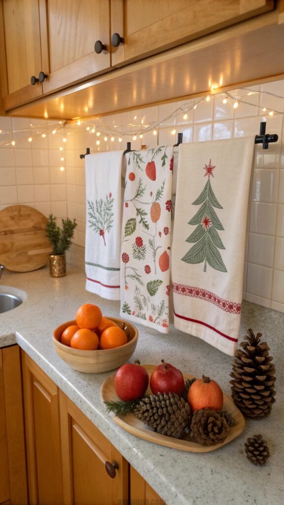 Bring the holiday spirit into your kitchen, the heart of many Christmas gatherings. Simple additions can make this space feel festive and inviting. Replace everyday dish towels with holiday-themed ones.