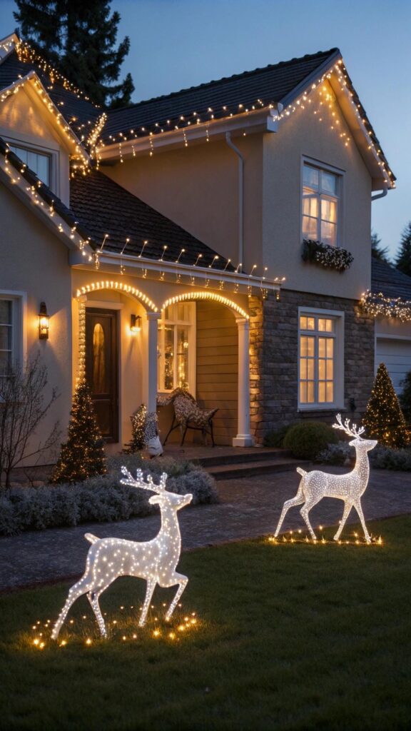 Outline your roofline, windows, and doorways with strings of lights. This highlights the architectural features of your home. Consider adding lighted lawn ornaments like reindeer or snowflakes.