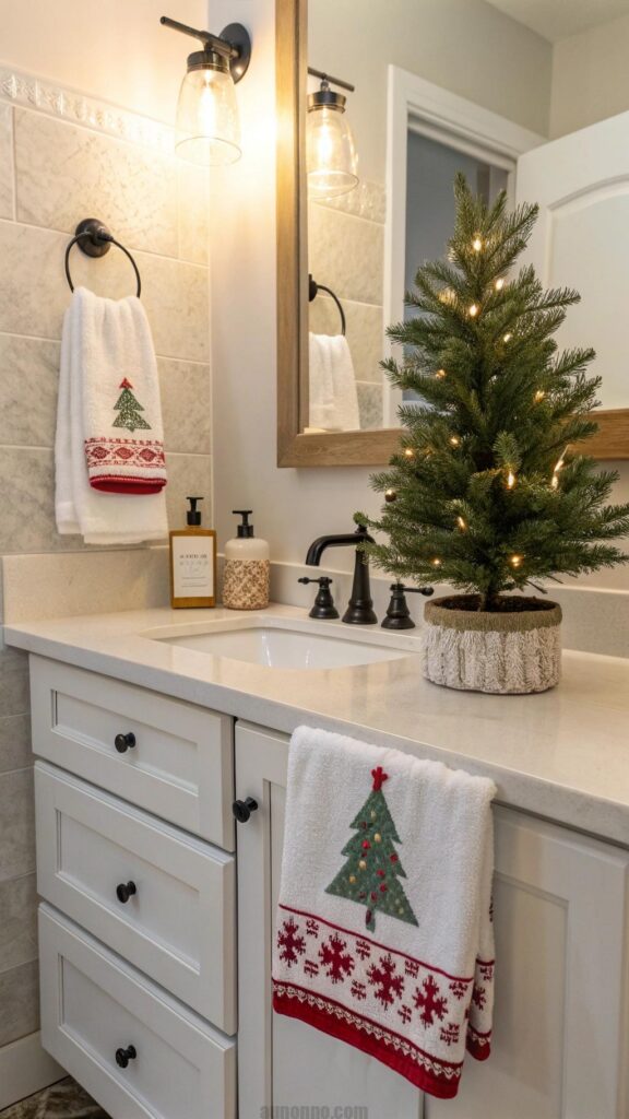 Add a small festive soap dispenser or a holiday-scented candle. A mini Christmas tree on the counter can also bring cheer. These details create a cohesive holiday feel throughout your home.