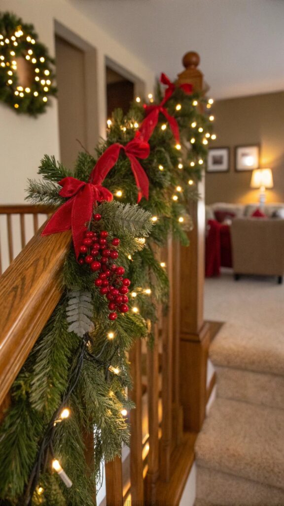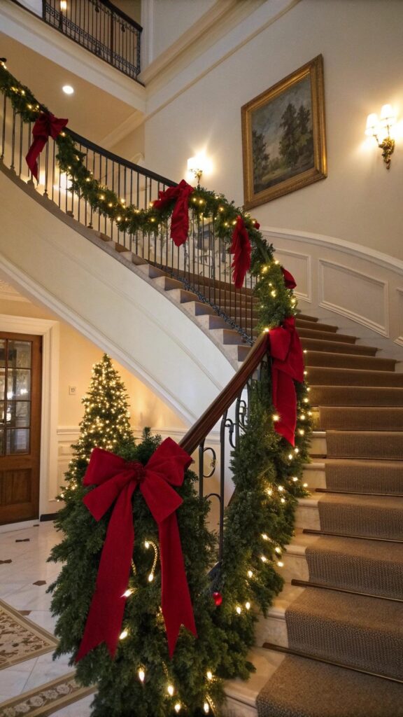 Transform your staircase into a festive focal point with garland and lights. This creates a dramatic and inviting pathway to upper floors. Wrap a thick, artificial or real evergreen garland around the banister.