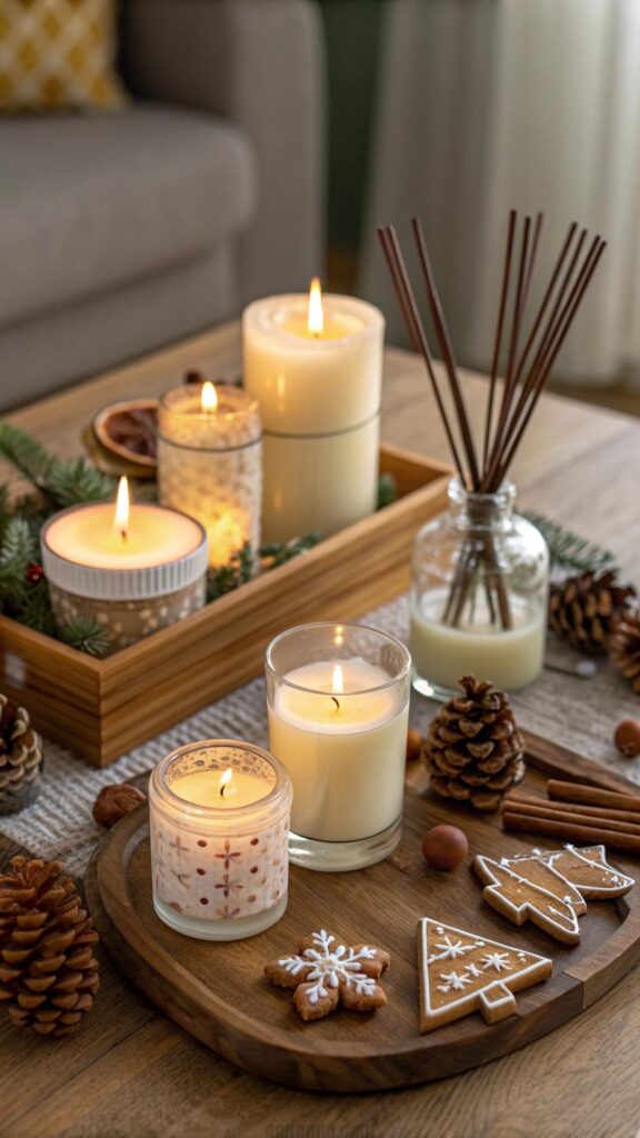 Use scented candles with holiday aromas like pine or cinnamon. Simmer pots with oranges, cloves, and cranberries. Diffusers with essential oils also work.