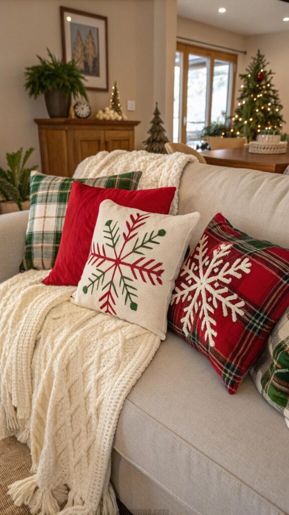 Transform your living room with festive throw pillows and cozy blankets. These soft furnishings add comfort and holiday cheer. Choose designs with Christmas motifs like snowflakes, reindeer, or classic plaids.