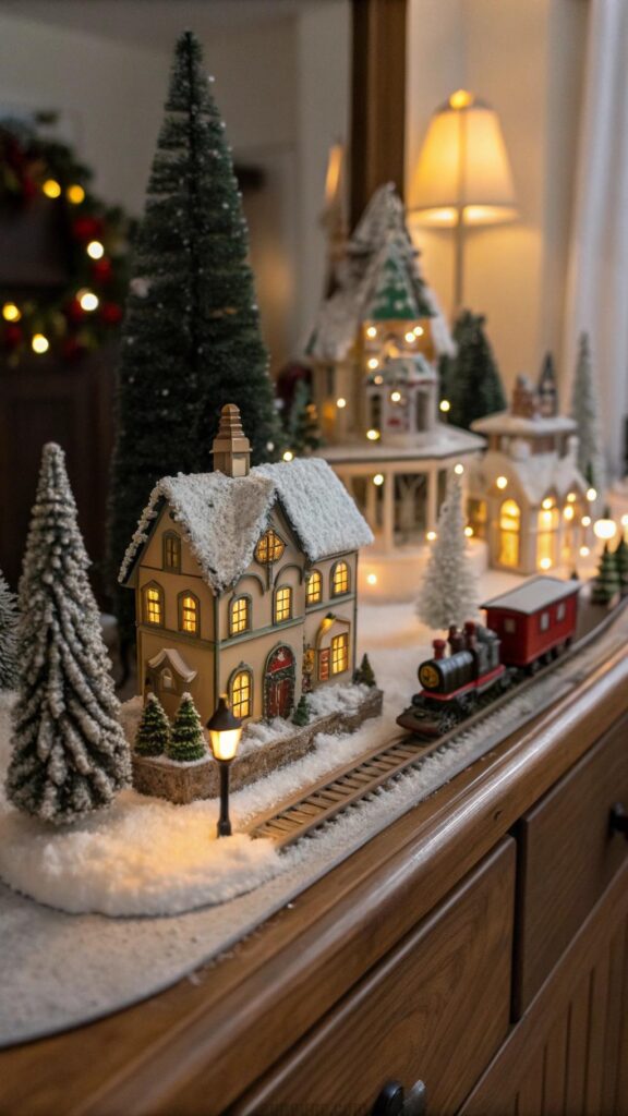 Create a charming Christmas village display on a console table or mantelpiece. These miniature scenes bring a whimsical touch to your holiday decor. Collect small houses, figurines, and tiny trees.