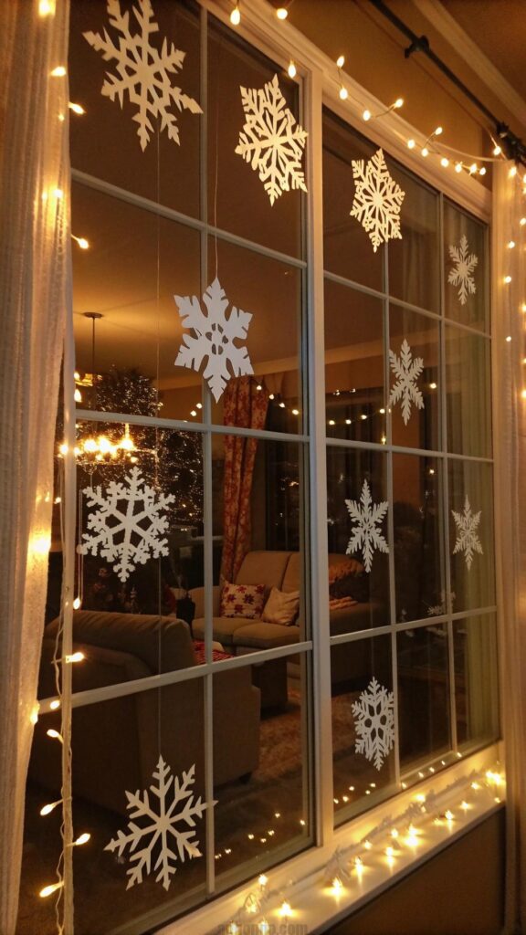 Adorn your windows with delicate snowflake decorations. These create a beautiful winter wonderland effect from both inside and outside. Use paper cutouts, static cling decals, or even painted designs.