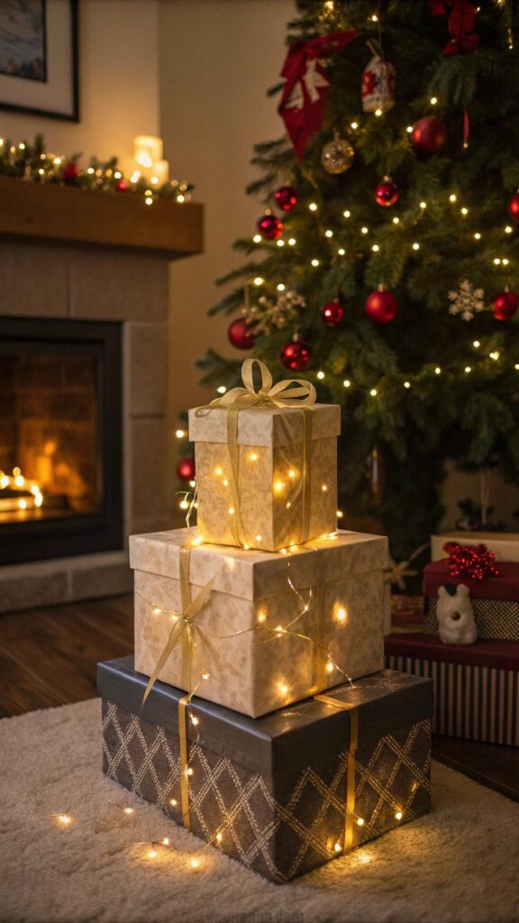 Create a magical display with illuminated gift boxes. These add a soft, festive glow to any corner of your home. Choose empty gift boxes in various sizes and wrap them in festive paper.
