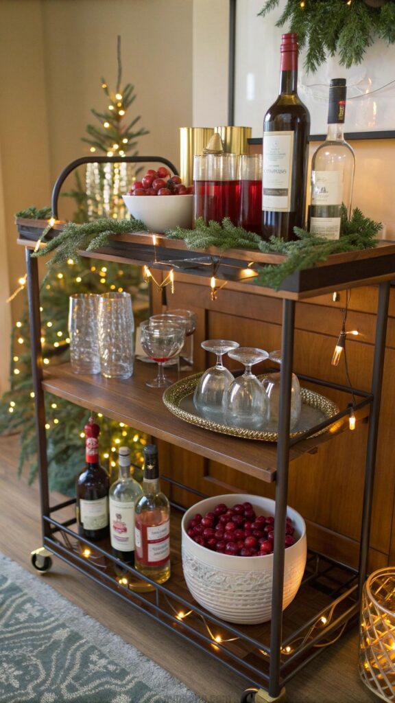 Set up a festive bar cart or beverage station for holiday entertaining. This makes serving drinks easy and stylish. Decorate it with small ornaments, mini garlands, and string lights.