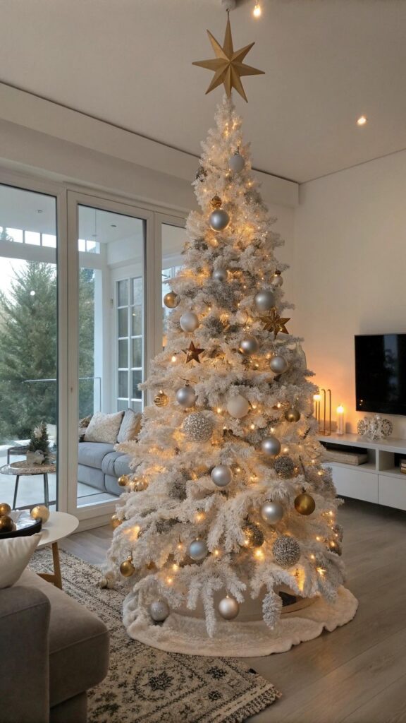 Decorate with silver and gold ornaments for a luxurious feel. Alternatively, use cool blue and purple tones for a winter wonderland theme. Add clear or cool white lights to enhance its frosty appearance.