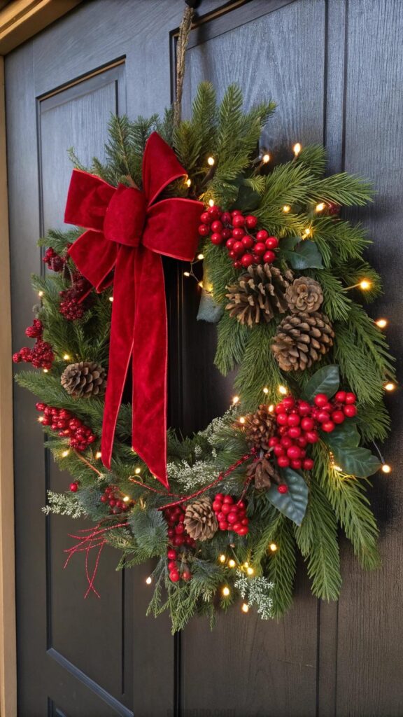 Embellish your wreath with pinecones, berries, and a large, coordinating bow. You can also add small battery-operated lights for evening sparkle. This creates a warm and inviting entrance.