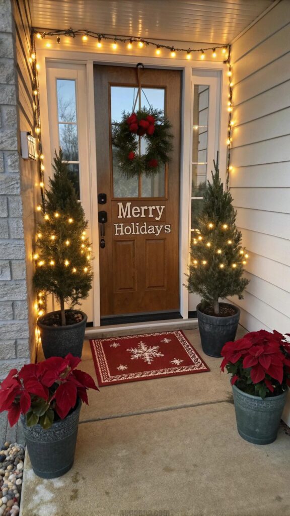 Complement the doormat with potted poinsettias or small evergreen trees on either side of the door. Add a string of outdoor lights around the door frame. This creates an inviting and festive entryway.