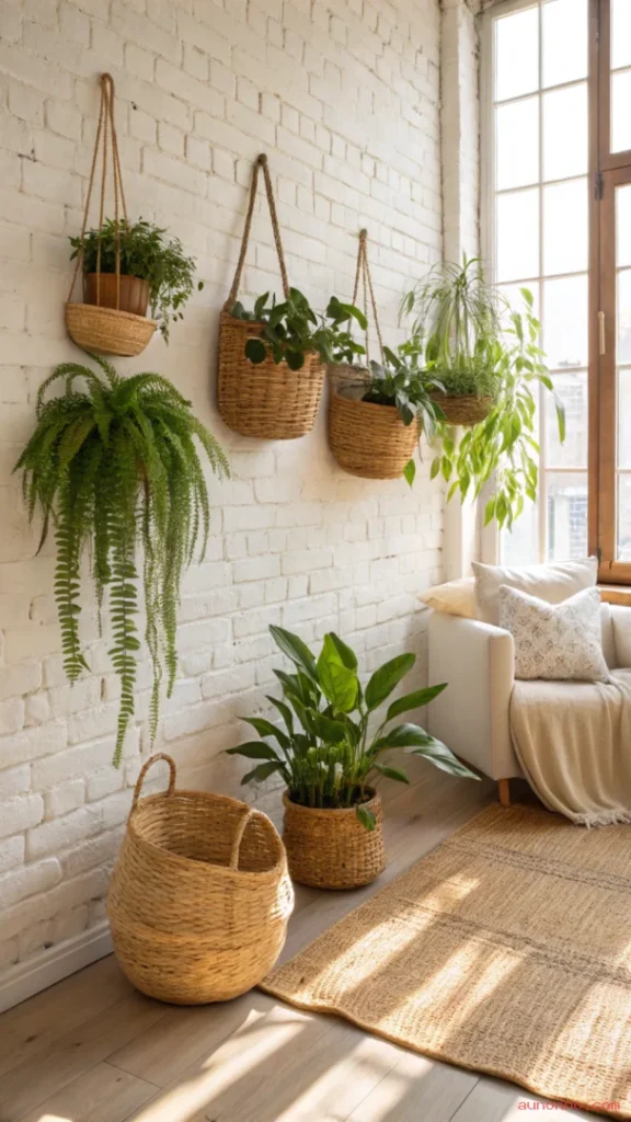 You can find wicker hanging baskets in various shapes — round, oval, and elongated — so mixing a few different styles together creates a collected, layered look. A wall of hanging wicker baskets filled with different shades of green is a simple way to create an indoor garden feature without using floor space.