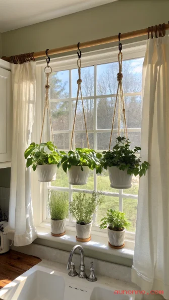 Herbs, trailing vines, and small ferns all do well on a window curtain rod because they get consistent, bright indirect light throughout the day. You can mix ornamental trailing plants with functional herbs so the window display is both beautiful and practical.