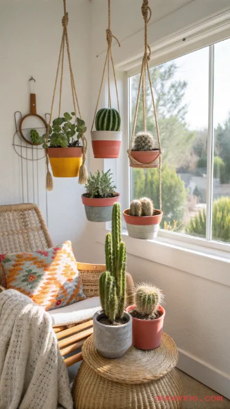 A sunny corner near a south-facing window is the ideal spot for a hanging cactus garden since cacti need maximum direct sunlight to stay healthy and compact indoors. Group three to five cacti at different heights in the same corner to create a desert-inspired vertical plant display.
