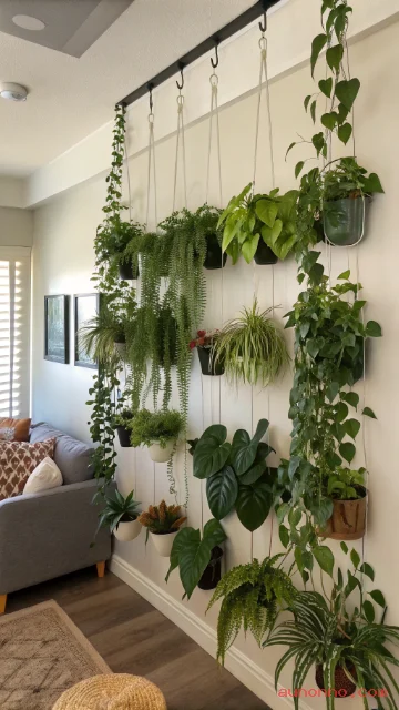 Hanging plants can function as stunning living room dividers in open-plan spaces. Suspend a horizontal wooden dowel or metal rod from the ceiling across the width of the room and hang a dense collection of trailing and bushy plants from it to create a natural green partition. This approach defines separate zones — living and dining, workspace and lounge — without using walls or heavy furniture.