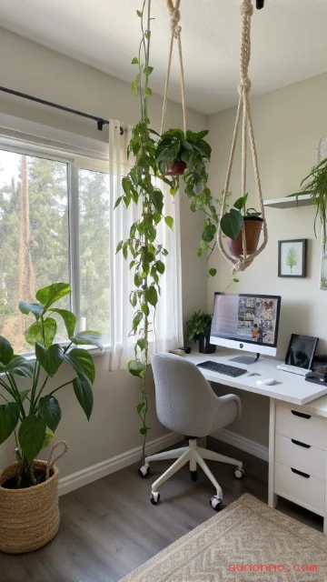Position a hanging planter near a window where you can enjoy the greenery while you work without it blocking natural light from your workspace. A trailing pothos hung behind your monitor or desk can create a beautiful green backdrop for video calls.