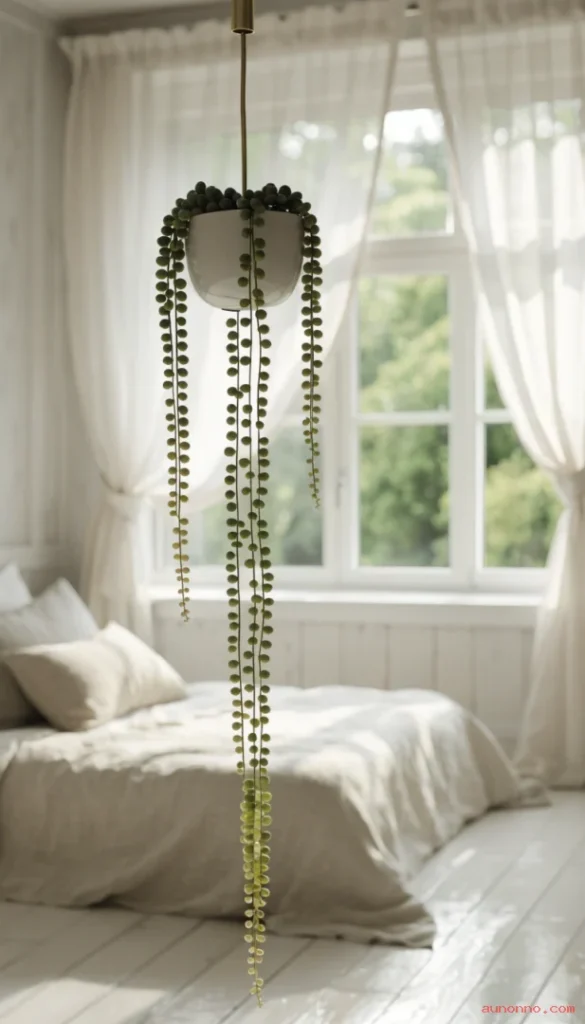 Place it near a bright south or east-facing window where it gets plenty of light without harsh direct afternoon sun burning its delicate leaves. A single string of pearls plant in a simple hanging pot looks effortlessly stylish in a minimalist or Japandi-style room.