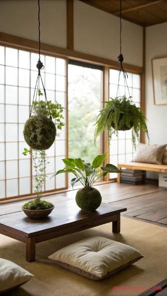 Kokedama is a Japanese art form that involves wrapping a plant’s roots in a ball of moss and binding it with string, then hanging the moss ball directly from the ceiling without any pot. The result is a floating green sphere of living moss with a plant growing from its center — it looks sculptural, organic, and utterly unique. Common plants used for kokedama include ferns, pothos, peace lilies, and small tropical plants.