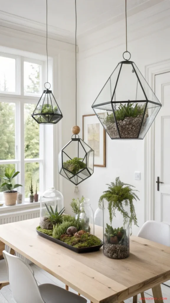 You can hang a single large teardrop terrarium as a statement piece above a dining table or reading nook. Alternatively, a cluster of small geometric glass terrariums at different heights creates a dramatic, jewel-like ceiling installation.