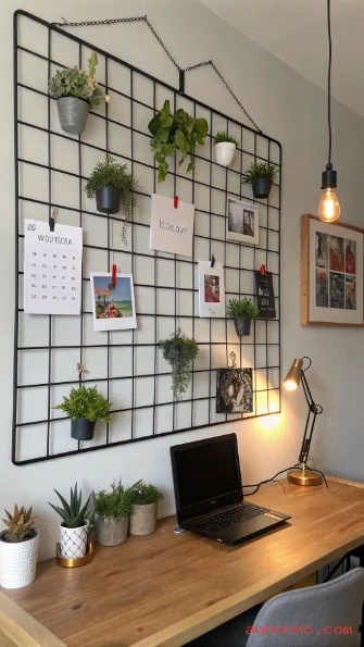 The beauty of the metal grid display is that you can also mix plant hangers with other items like small framed prints, notes, and decorative hooks to create a full lifestyle display panel. This approach works brilliantly in home offices, bedrooms, and kitchen walls.