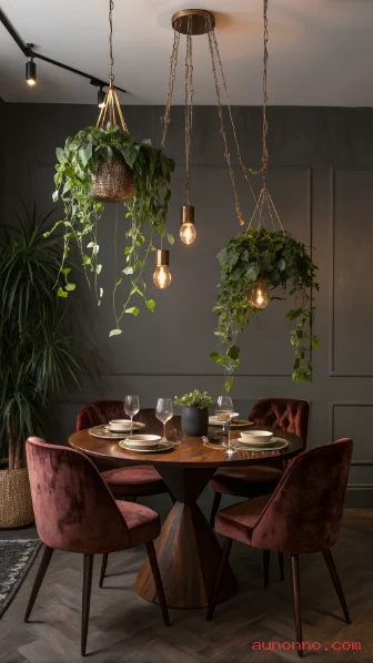 Hanging a cluster of plants directly above the dining table creates an intimate, garden-party atmosphere that makes every meal feel special. Replace a standard light fixture with a cluster of hanging planters combined with pendant lights, or position the plants just beside the light for a layered, organic canopy effect. Trailing plants like pothos, heartleaf philodendron, and string of hearts work best here because their vines frame the table without dropping leaves into the food.